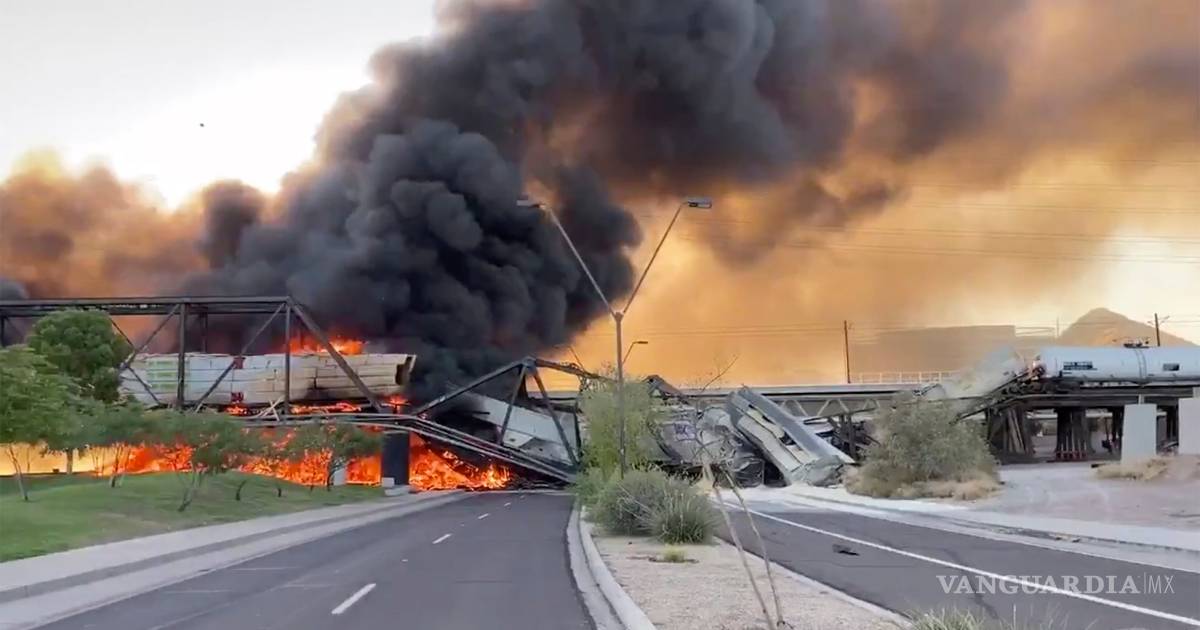 ARIZONA, EU.- Un tren carguero que se desplazaba por un puente que cruza un lago en un suburbio de Phoenix se descarriló ayer, causando que la estructura se incendiara y se derrumbara parcialmente, dijeron funcionarios. Imágenes de video mostraban grandes llamas y espeso humo negro elevándose, y tres vagones caídos en un parque contiguo al lago Tempe Town.