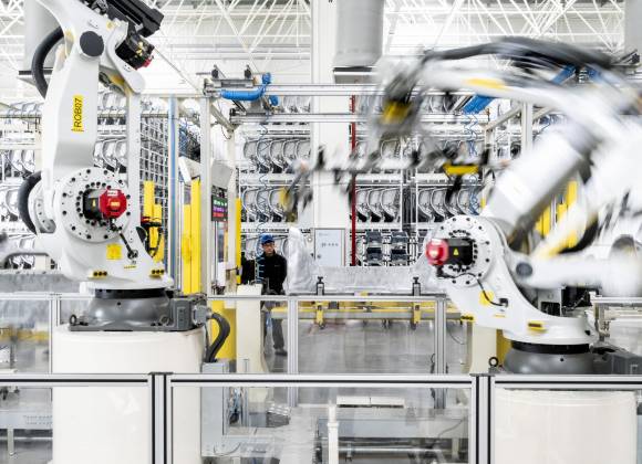 Otros robots trasladan los paneles a la cadena de montaje, donde cientos de brazos robóticos, trabajando en equipos de hasta 16, interpretan una compleja danza para soldarlos y convertirlos en carrocerías. La zona de soldadura es una de las llamadas fábricas oscuras, lo que significa que los robots pueden funcionar sin trabajadores y con las luces apagadas.