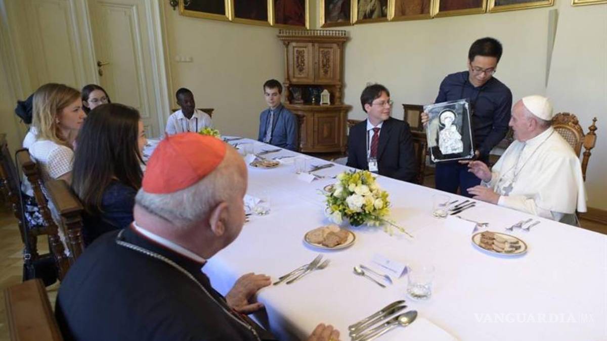 Como es tradición en cada Jornada Mundial de la Juventud (JMJ), el líder católico invitó a muchachos y muchachas de los cinco continentes a compartir su mesa. Con ellos habló en español y degustó comida típica de Polonia, con pasta frita y carne de plato principal.