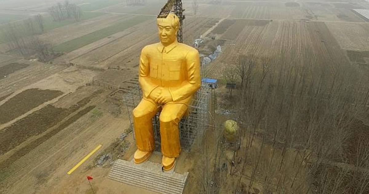 Recubierto en pintura dorada, la figura de Mao Zedong sobresale en la planicie. Sentado, con las manos unidas en su cintura, el dictador chino mira el horizonte. Detrás suyo, una grúa ultima los detalles de lo que será la gigantesca silla en la cual reposará.
