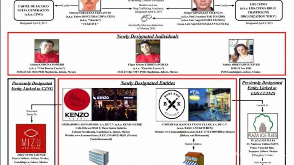 Entre las entidades sancionadas figura Operadora Los Famosos, que funciona bajo el nombre de Kenzo Sushi, un restaurante ubicado en Guadalajara, y a sus propietarios Alfonso Corona Romero y Edgar Alfonso Corona Robles, acusados de actuar como testaferros para el cartel de Jalisco y Los Cuinis.