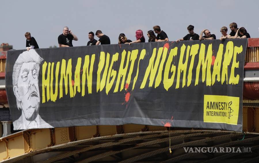 Poco después de que el mandatario estadounidense, acompañado de su mujer Melania, aterrizara hoy en suelo británico, AI desplegó el cartel en el puente de Vauxhall sobre el río Támesis, a escasos metros de la embajada de EU en Reino Unido, donde pasará la noche.