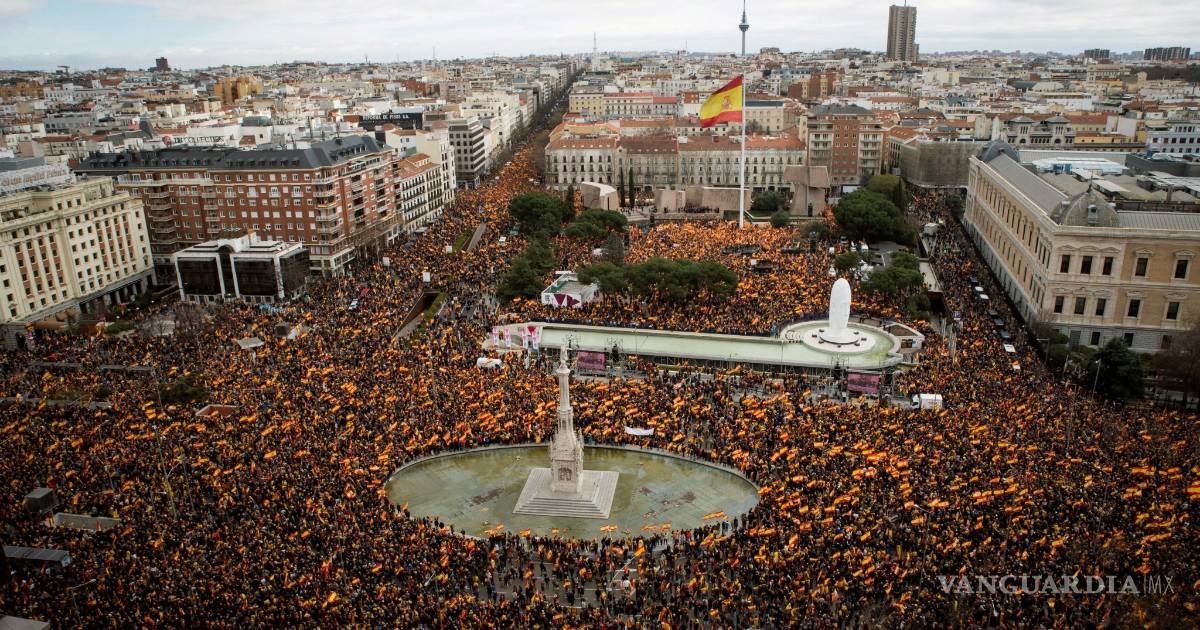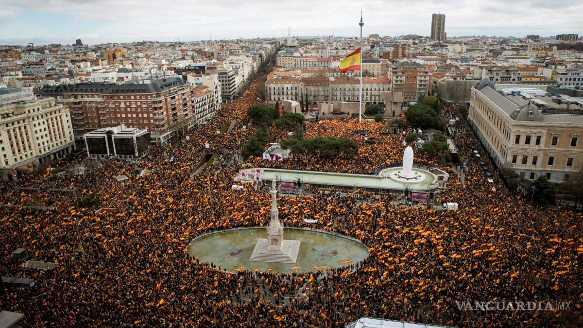 MADRID, ESP.- Miles de españoles participaron en una multitudinaria manifestación, convocada por partidos de derecha, para pedir la dimisión del presidente del gobierno, Pedro Sánchez. El conservador Partido Popular y la formación de centroderecha Ciudadanos, ambos en la oposición, organizaron el acto, que contó con el respaldo de la ultraderechista Vox y de otras formaciones marginales de la derecha radical.