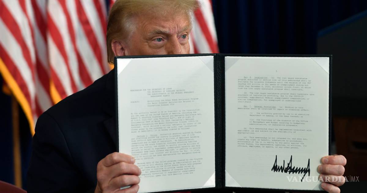 Entre las medidas figuran una prestación adicional de 400 dólares semanales para desempleados (frente a los 600 dólares iniciales), una suspensión de los impuestos sobre las nóminas y una prórroga de la moratoria a los desahucios, entre otras.