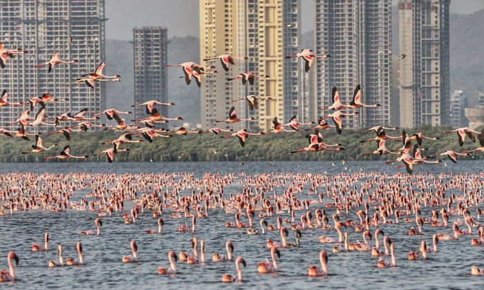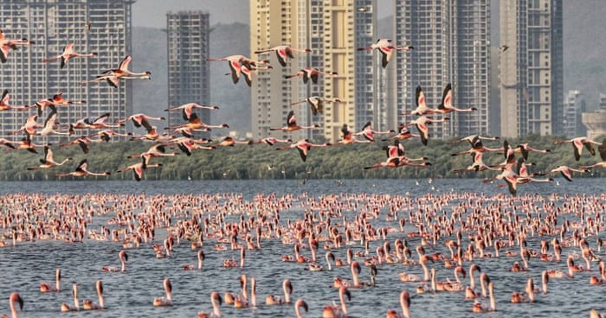 Miles de flamingos pintan de rosa las aguas de Bombay