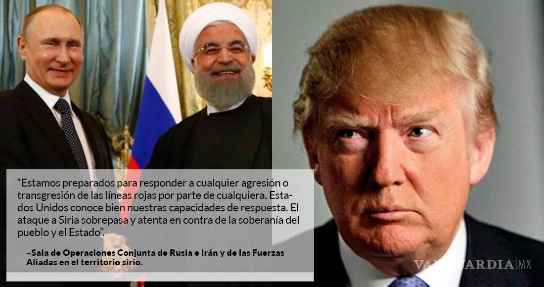 WASHINGTON.- La Sala de Operaciones Conjunta de Rusia e Irán y de las Fuerzas Aliadas en el territorio sirio avisó hoy de que ambos países están listos para responder a cualquier agresión, tras el ataque de Estados Unidos hace dos días a una base siria, informó el diario gubernamental sirio Tishrín en su página web.
