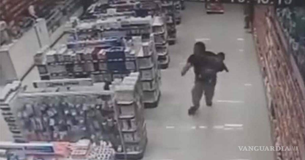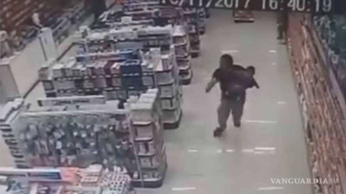 Enseguida, según muestra el video de las cámaras del circuito de seguridad, el policía, aún con su hijo en brazos, corrió hacia la parte delantera de la farmacia para disparar al otro asaltante.