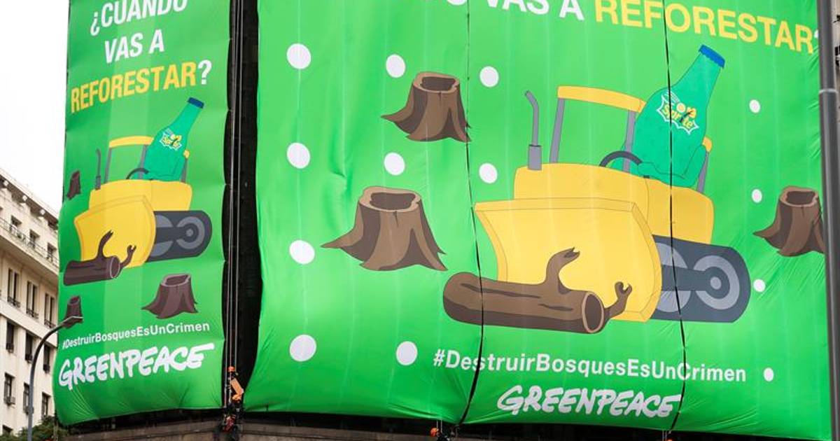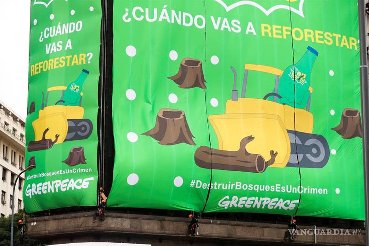 La ONG ambientalista Greenpeace tapó hoy una pantalla publicitaria gigante en el centro de Buenos Aires con una pancarta en protesta contra la marca de bebidas de Coca-Cola Sprite, a la que acusa de destruir bosques protegidos en el norte de Argentina.