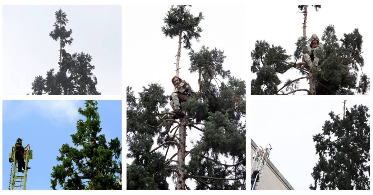 Cuando finalmente descendió del todo en la mañana del miércoles, los ciudadanos concentrados en la base de la conífera le animaron al grito de "Hombre en árbol".