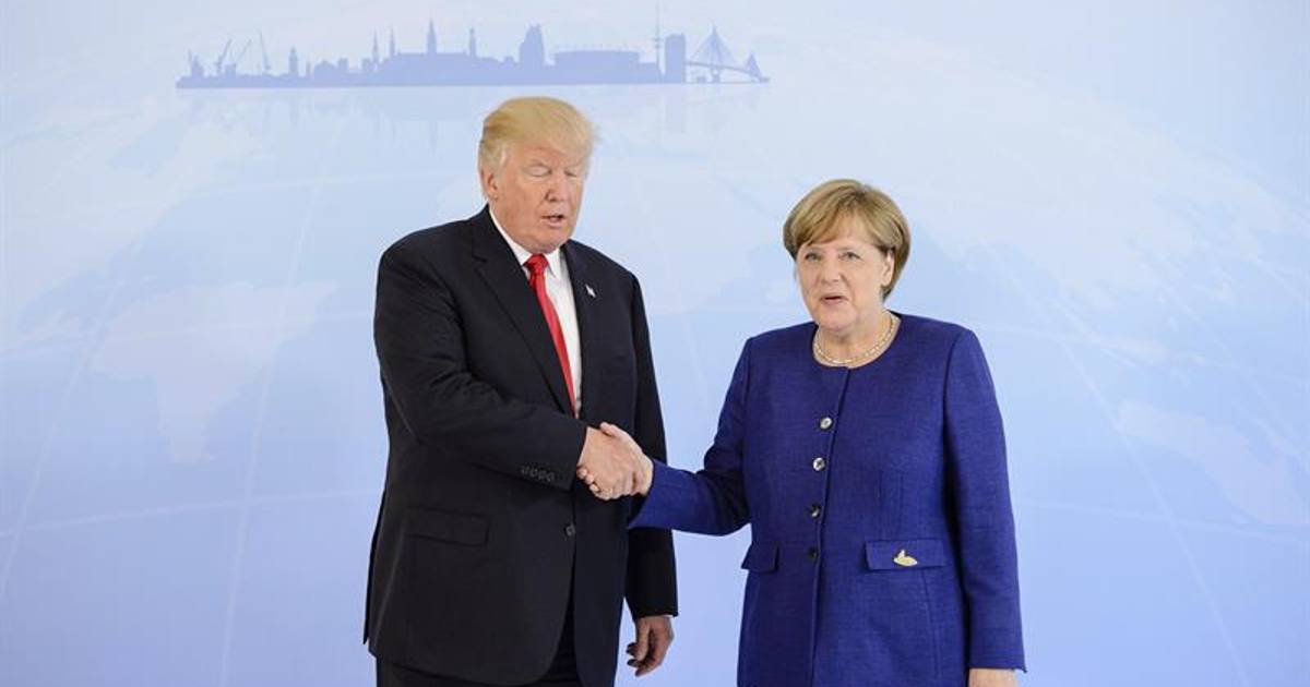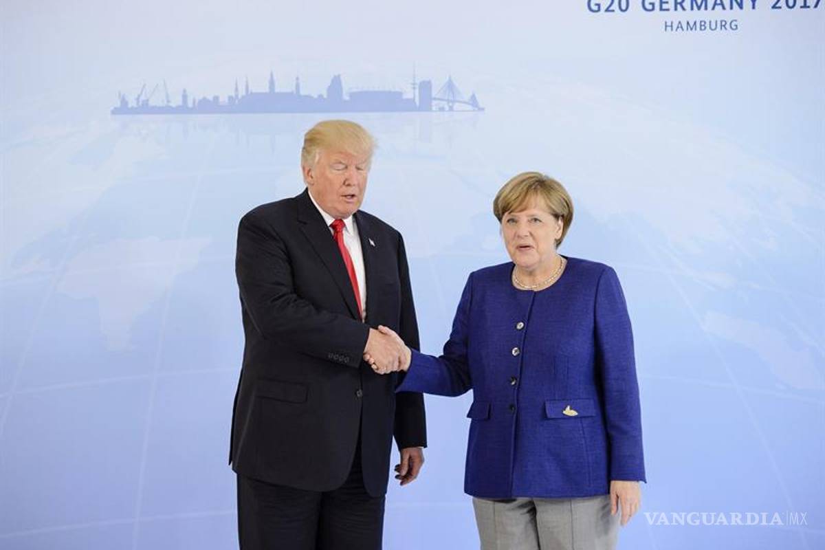 El decorado incluye un globo terráqueo con la inscripción "Make America Great Again" (lema de la campaña de Trump), la edición de un diario titulado "German Fake News" (Noticias falsas alemanas) y un chocolate mexicano como obsequio de bienvenida.