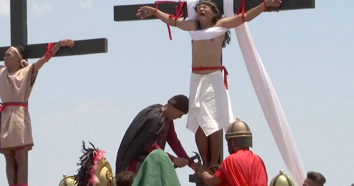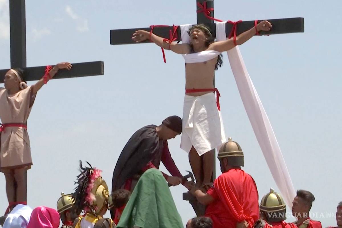 Cuatro clavos de acero de diez centímetros, dos atravesando las manos y otros dos los pies, fijaron a Ruben Enaje a una cruz de madera ante la mirada de las 60.000 personas.