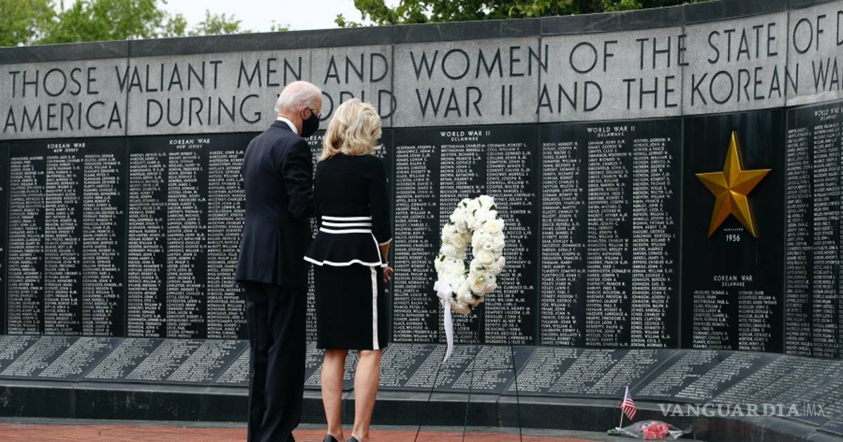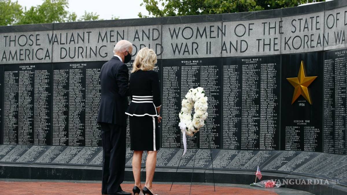 Biden y su esposa, Jill, colocaron una corona de flores blancas con un listón blanco atado e inclinaron sus cabezas en silencio. Rindió homenaje y se le escuchó decir “nunca olvidaremos”.