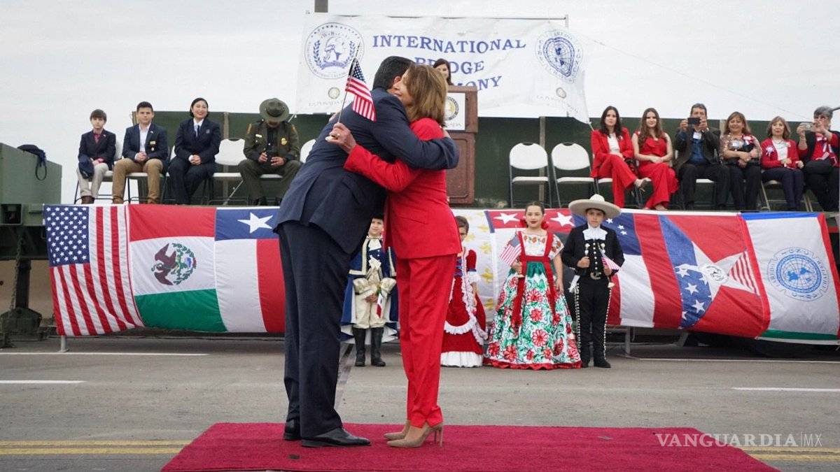 Laredo, Texas.- Mientras el presidente Donald Trump insiste en sus planes de militarizar la frontera con México, la líder de la mayoría demócrata en la Cámara de Representantes, Nancy Pelosi, quiso celebrar ayer el nacimiento de George Washington sobre el puente internacional que une a los dos países con un abrazo que la unió al gobernador del estado mexicano de Tamaulipas, Francisco García Cabeza de Vaca.