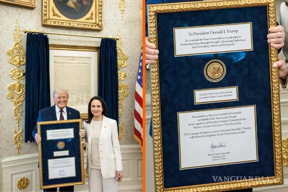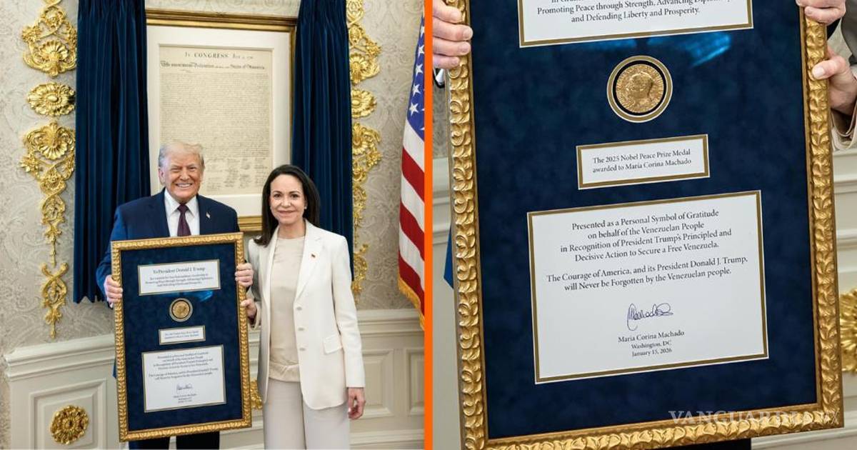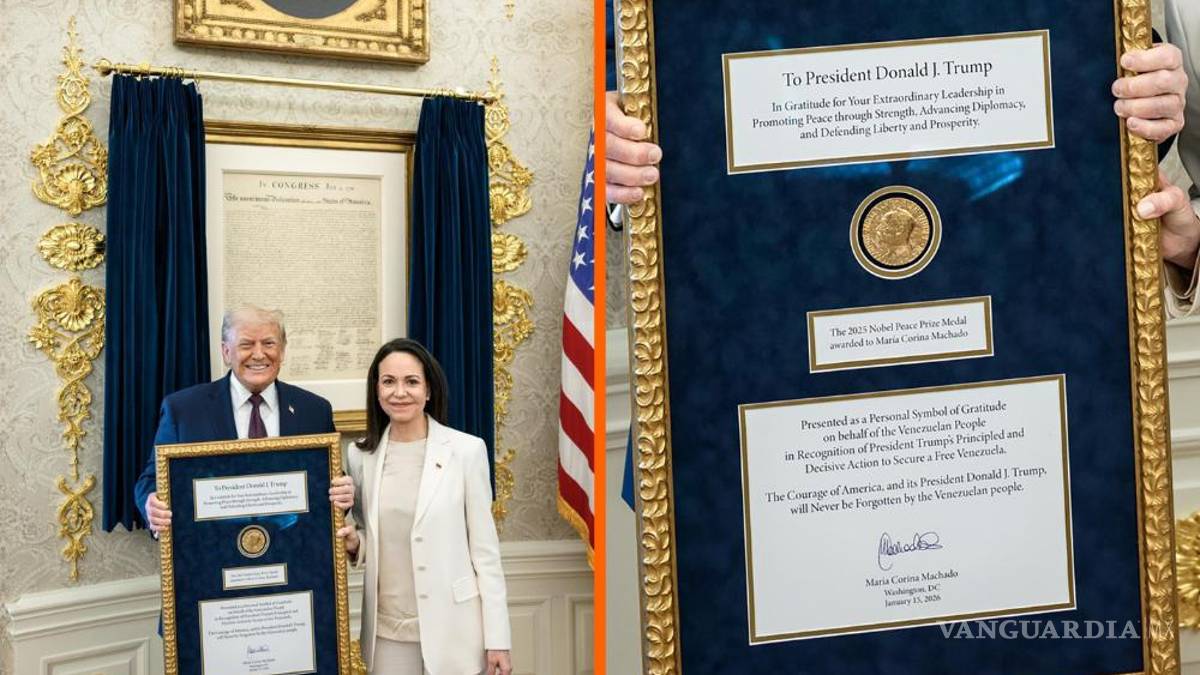 Machado utilizó un marco con detalles dorados para colocar la medalla del Nobel que obsequió al presidente y en la parte superior escribió: “en gratitud por su extraordinario liderazgo para promover la paz” y agregó que es un detalle del pueblo venezolano por sus acciones para encaminar “su libertad”, de acuerdo con fotos de la entrega en la Casa Blanca, difundidas por el New York Post.
