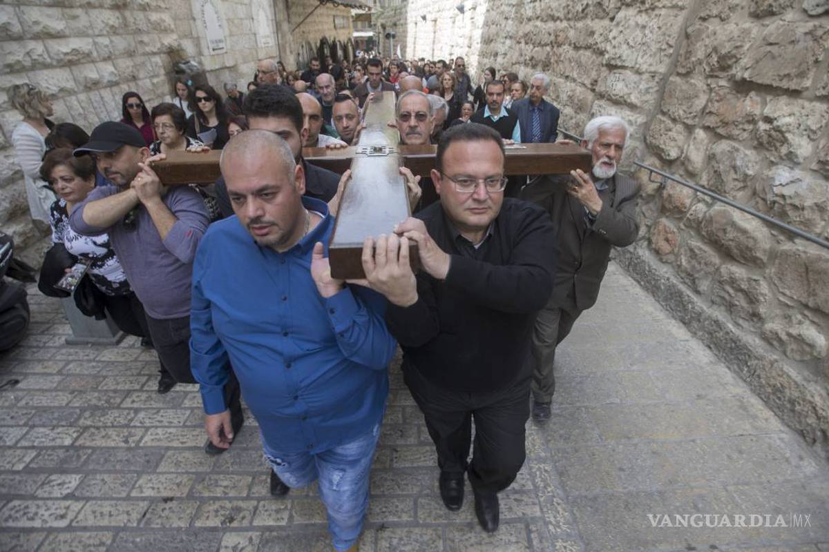 Cristianos palestinos y peregrinos de todo el mundo marcharon cargando cruces de madera al hombro por la Vía Dolorosa y hasta la Iglesia del Santo Sepulcro, siguiendo el camino que, según la tradición cristiana, recorrió Jesucristo con la cruz a cuestas antes de su crucifixión. En esa iglesia fue enterrado Jesús, según la creencia cristiana.