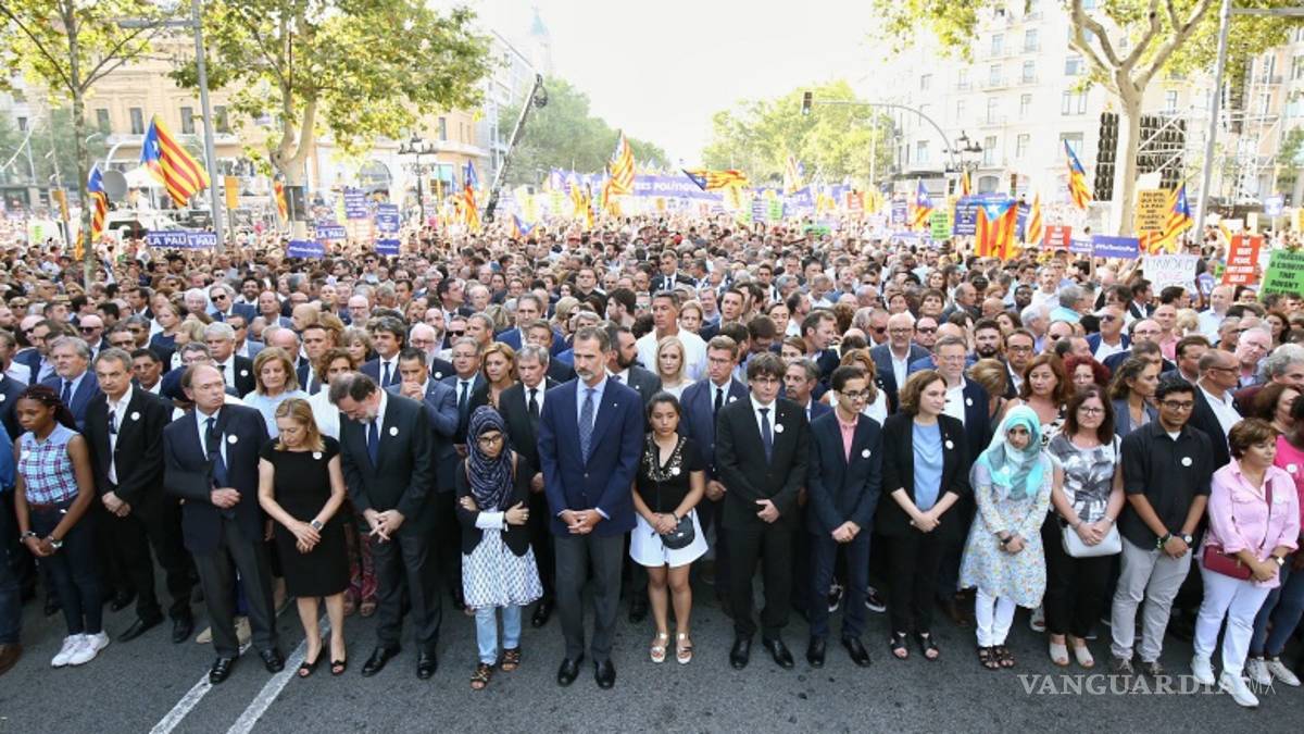 Miles de personas, entre ellas las máximas autoridades españolas, participan hoy en una manifestación que recorre Barcelona contra el terrorismo y en apoyo de las víctimas de los atentados yihadistas cometidos la semana pasada en la región de Cataluña (noreste).