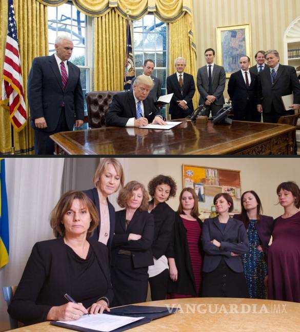 La foto de la vice premier de Suecia, Isabella Lövin, haría referencia a la imagen del Presidente de EU en la que aparece firmando un decreto antiaborto