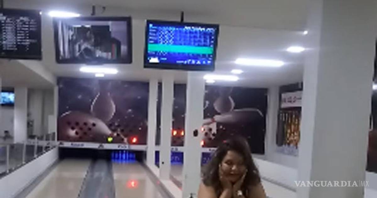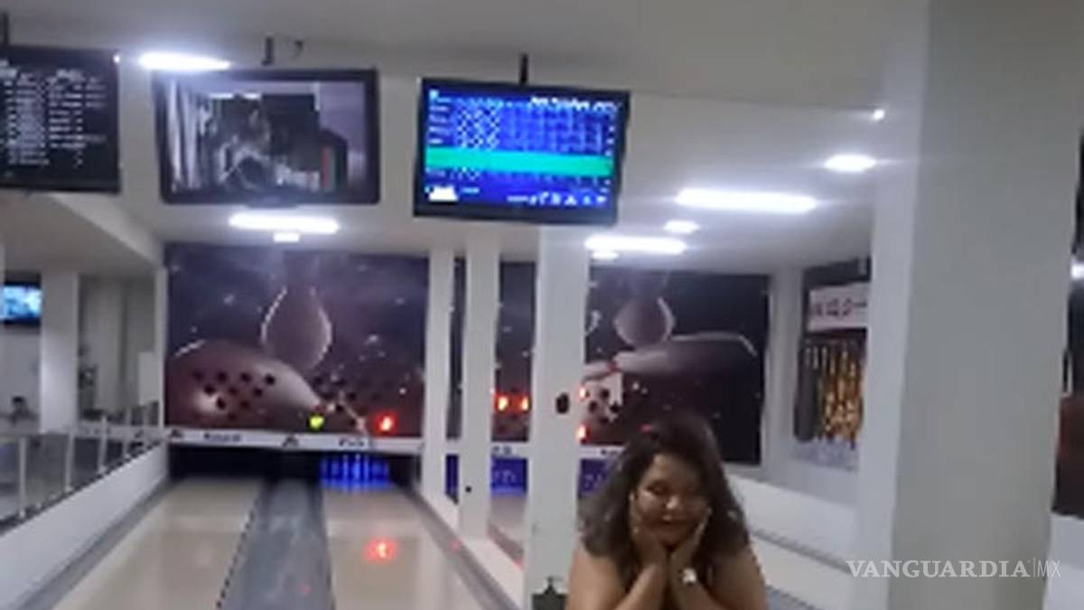 En el video se observa a la mujer tomar una bola de color verde, mientras se escucha a sus familiares darle consejos. Ella se para frente a la línea y se prepara para hacer su lanzamiento, toma vuelo y al momento de lanzar la bola… esta termina estrellándose directamente en una de las pantallas.