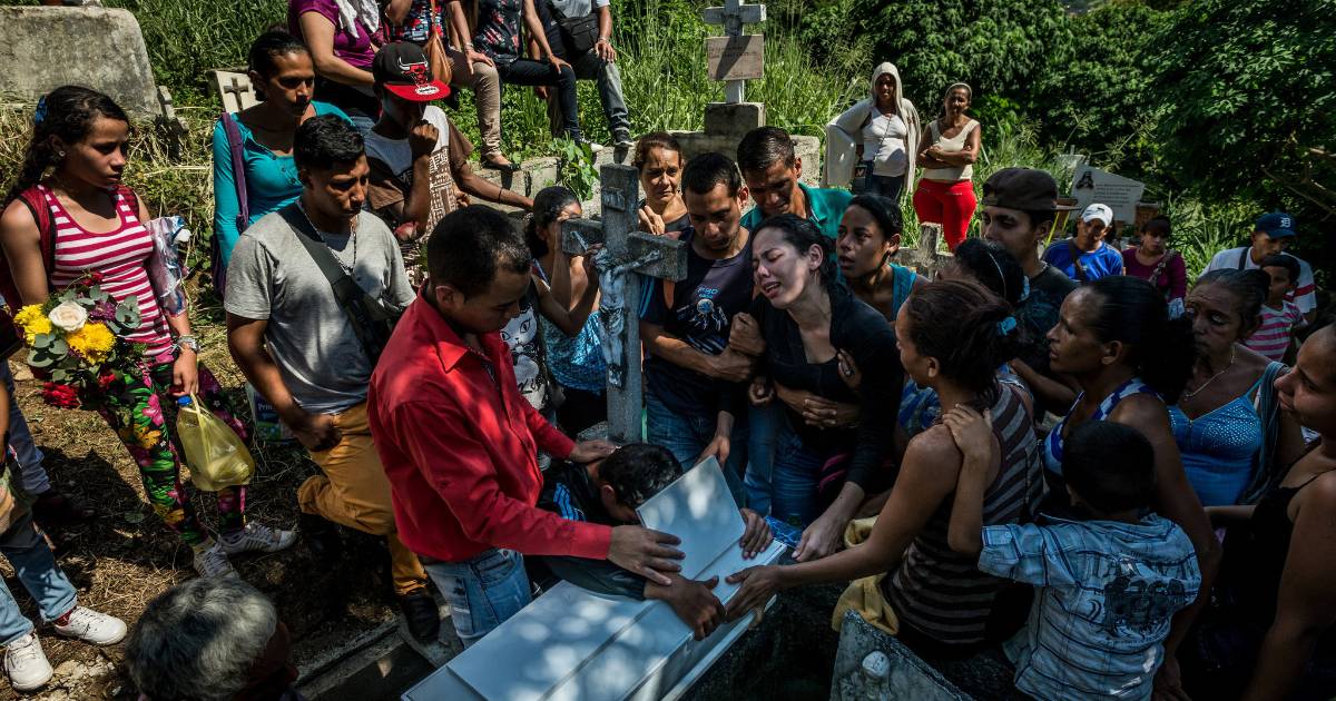 Se podían ver claramente la espina dorsal y las costillas de Kenyerber mientras le inyectaban los químicos de embalsamar. Las tías intentaban mantener alejados a los primitos curiosos. Sus familiares llegaron con flores y reutilizaron cajas de alimentos que reparte el gobierno a través de los Comités Locales de Abastecimiento y Producción (CLAP), de las que dependen cada vez más los venezolanos ante la escasez de comida y los precios altísimos, para recortar dos pequeñas alas de cartón. Las pusieron cuidadosamente encima del ataúd de Kenyerber, una práctica común entre los venezolanos, para que su alma pueda alcanzar el cielo.