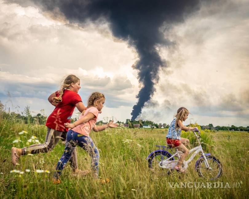 En la fotografía se ve a Alina, que tiene cinco años, andando en bicicleta junto a sus amigas, en tanto que en el fondo se puede apreciar una columna de humo de un depósito de petróleo que la noche anterior se incendió después de ser impactado por un dron.
