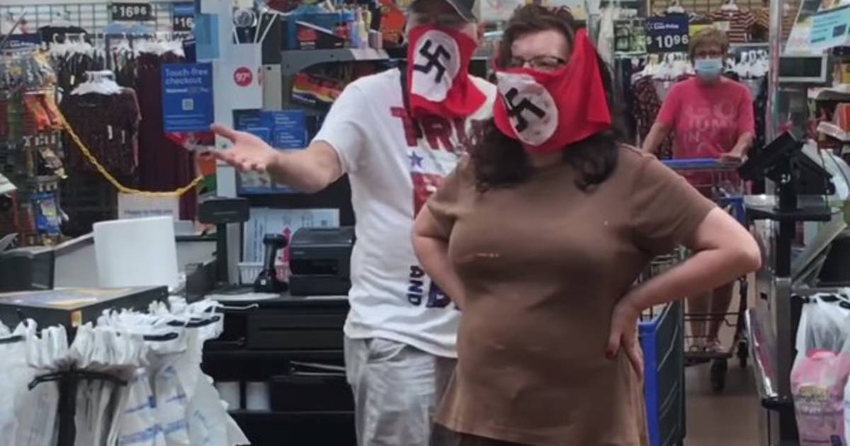 This couple wore Nazi flags around their faces inside a Walmart in Marshall, MN to protest the statewide mask mandate that took effect today. I confirmed with a store manager. Video was posted to FB by Raphaela Mueller pic.twitter.com/t3v96PKh25