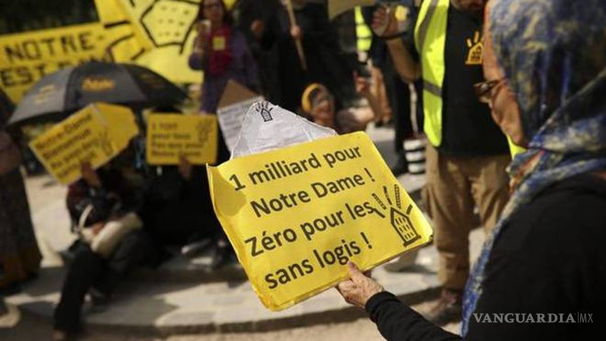 Unas 50 personas de una asociación francesa de personas sin hogar se reunieron con pancartas que decían "1,000 millones en 24 horas". Cantaron consignas dirigidas a Bernard Arnault, director general del grupo de lujo LVMH, quien la semana pasada prometió 200 millones de euros (226 millones de dólares). Algunos corearon "Notre Dame necesita un techo, nosotros también necesitamos un techo".
