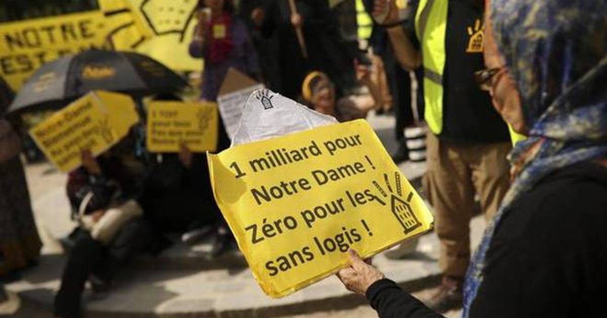 Docenas de defensores de la vivienda pública protestaron el lunes frente a la destruida Notre Dame en París para exigir que se recuerde a los más pobres de Francia después de que los donantes prometieron 1,000 millones de dólares para reconstruir la catedral.