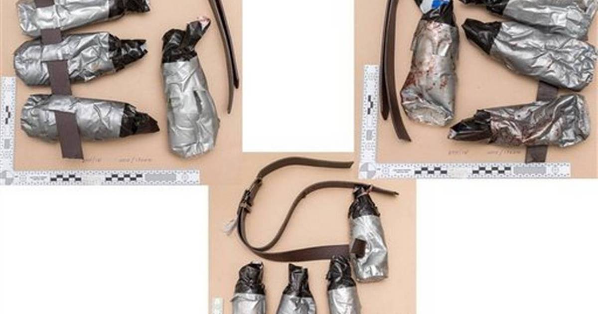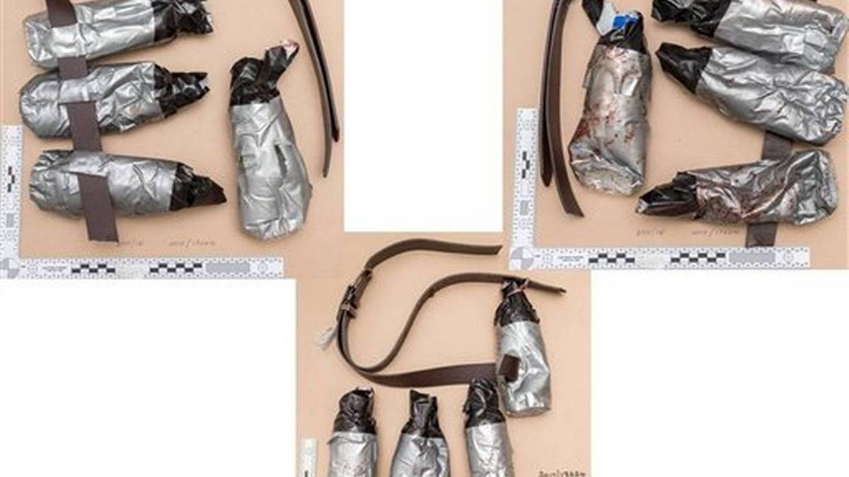 La Policía Metropolitana publicó varias imágenes de los cinturones manchados de sangre, que estaban fabricados con botellas de agua de plástico forradas de cinta de embalaje.