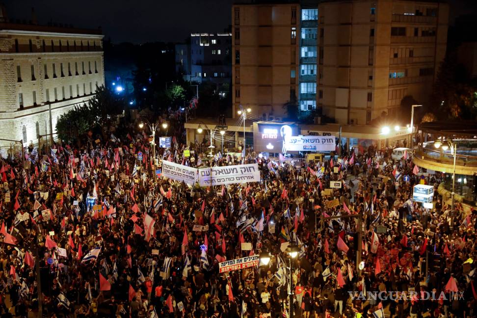 Los inconformes agitaron banderas israelíes y otras de color magenta, que se han convertido en un símbolo del movimiento de protestas, mientras marchaban por Jerusalén hacia una plaza cercana a la residencia oficial de Netanyahu. Otras protestas se llevaban a cabo en otras partes del país.