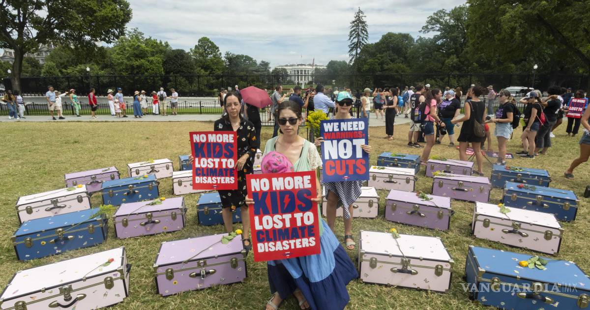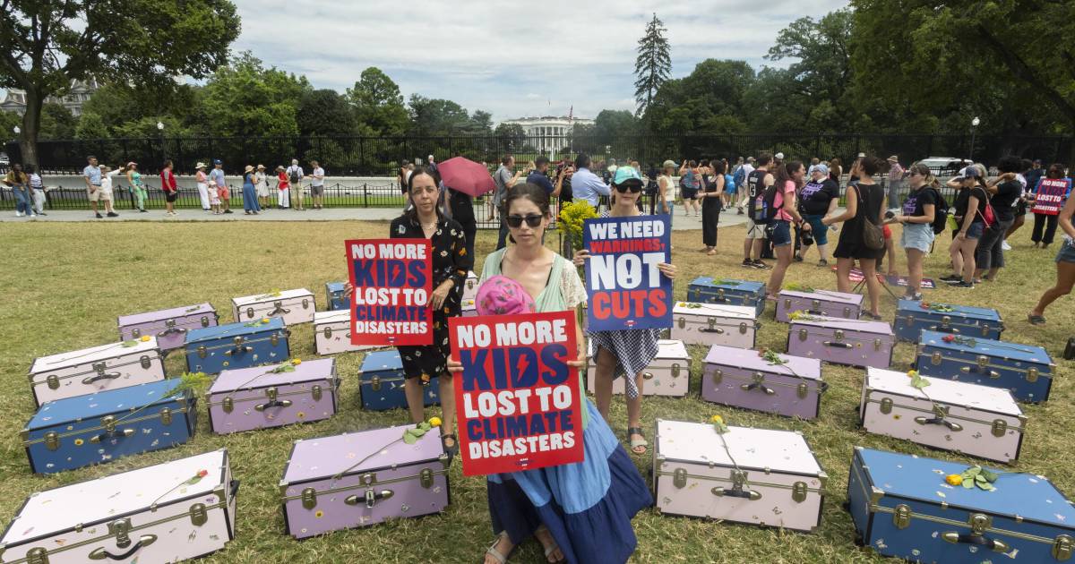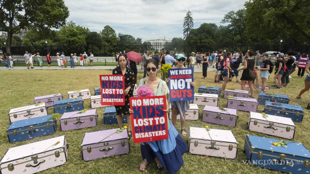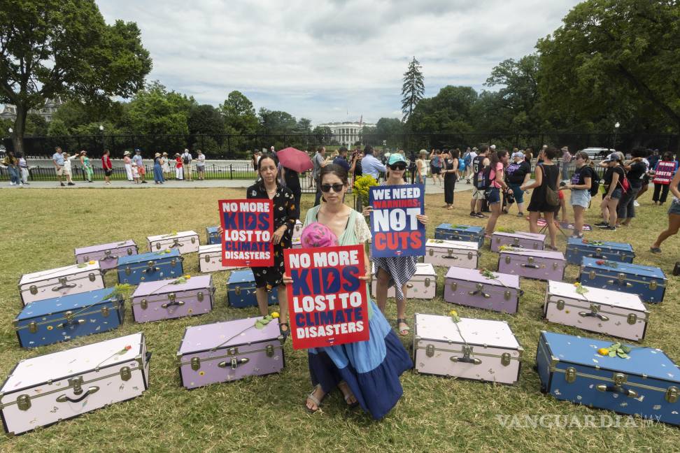 Activistas y padres de familia colocan 27 baúles frente a la Casa Blanca para pedir justicia por las niñas y consejeras que fallecieron un campamento de verano en las inundaciones de principios de mes