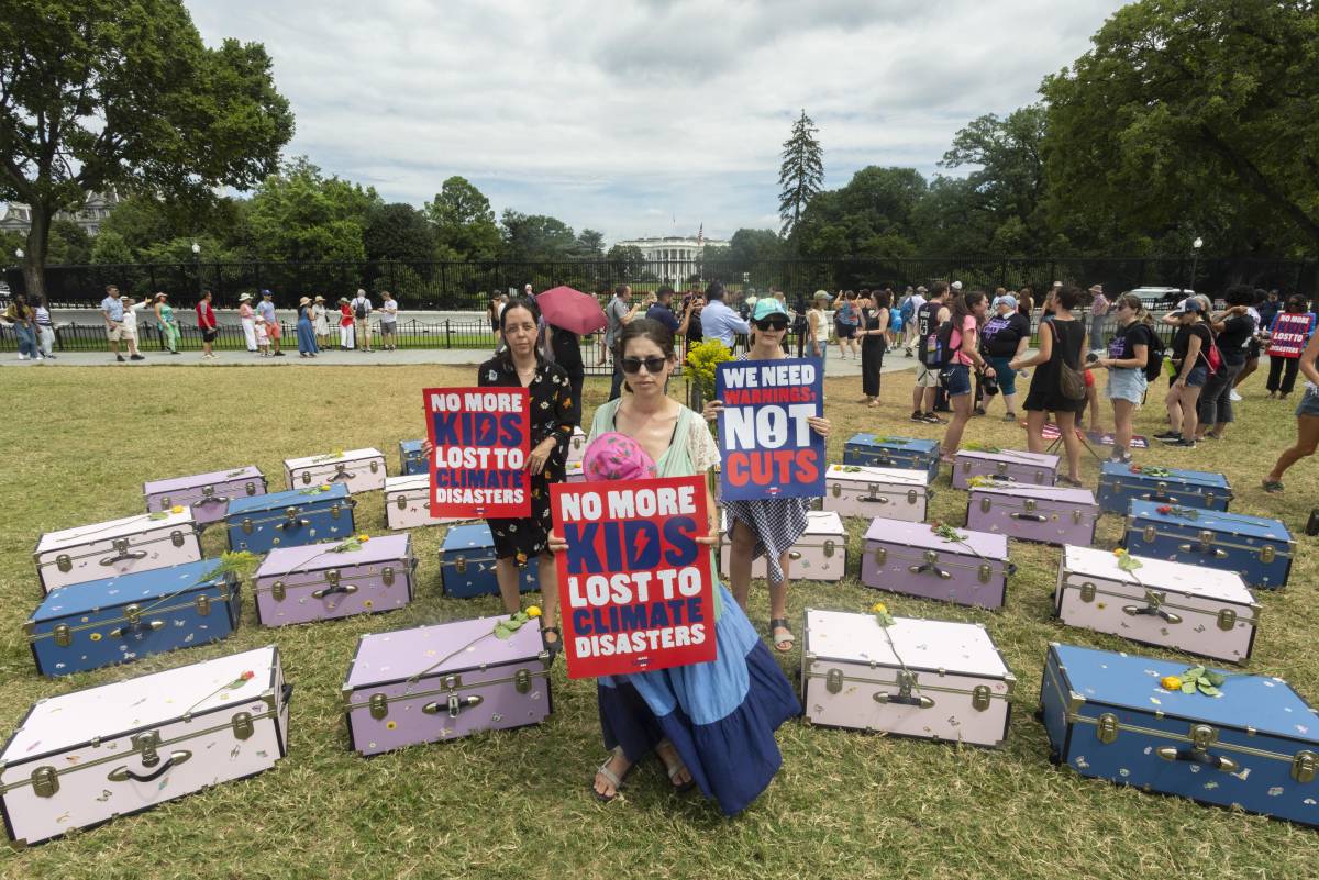 Un grupo de padres y de activistas colocaron 27 baúles del Camp Mystic frente a la Casa Blanca para pedir justicia por las niñas y consejeras que fallecieron a causa de las inundaciones a principios de este mes.