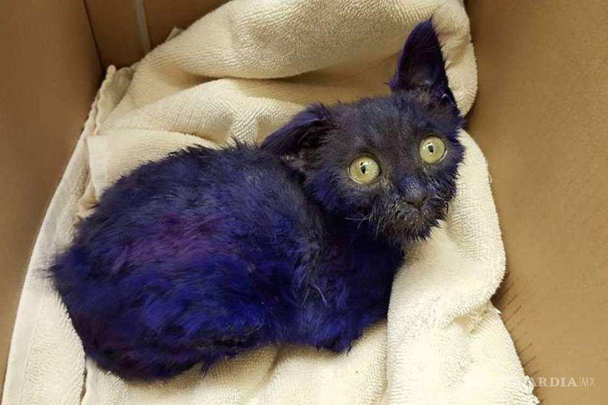 Un pequeño gatito de apenas unos dos meses de edad fue rescatado en California por un refugio de animales local. El felino presentaba graves heridas, además de que estaba pintado de color púprura.