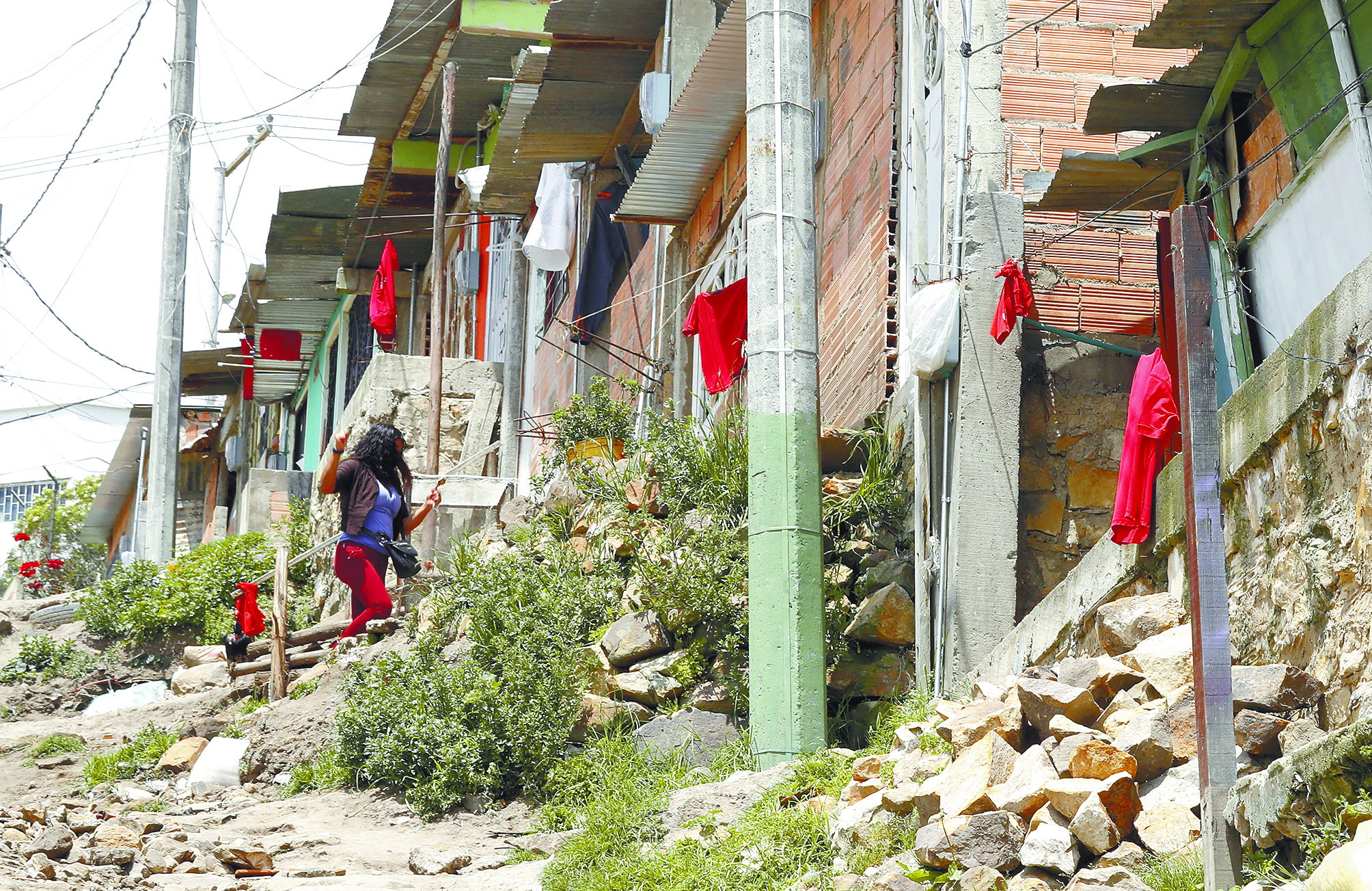 Ese fenómeno es más visible en la Comuna 4 de Cazucá, levantada sobre una montaña, con calles mayoritariamente sin asfalto, donde casi todas las casas tienen un trapo rojo colgando porque quienes las habitan no tienen medios para abastecerse durante la cuarentena que comenzó el pasado 25 de marzo y debe concluir el 13 de abril.