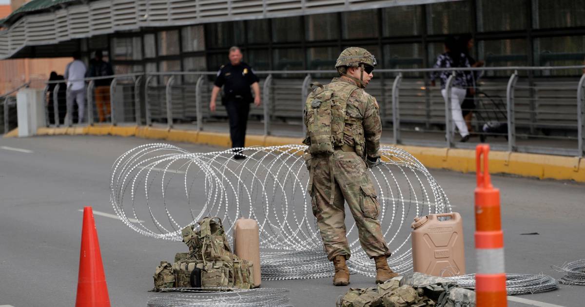 Miembros del ejército de Estados Unidos colocan alambradas a lo largo de la frontera de EU y México en el Puente Internacional McAllen-Hidalgo en McAllen, Texas