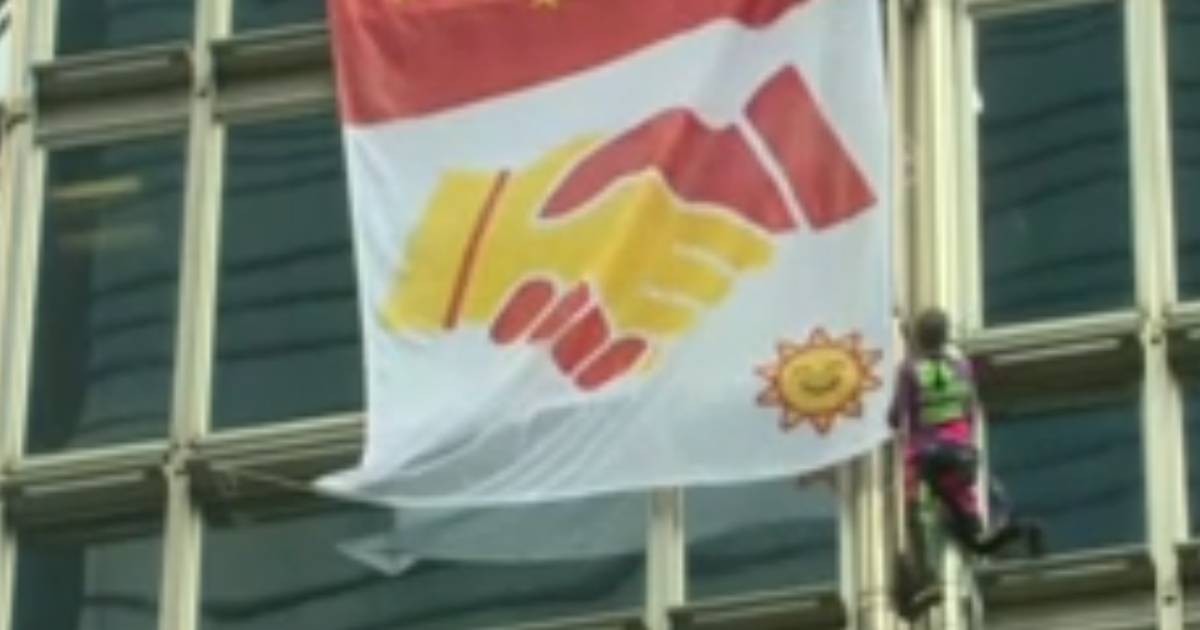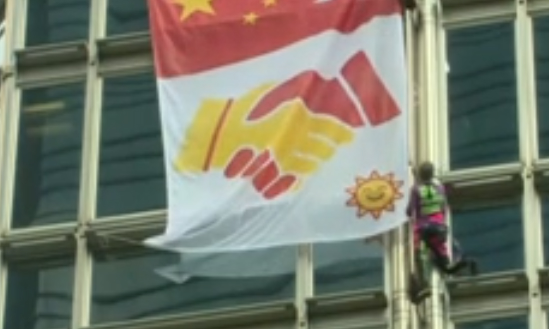 'Spiderman' scales Hong Kong skyscraper, unfurls 'peace' banner.