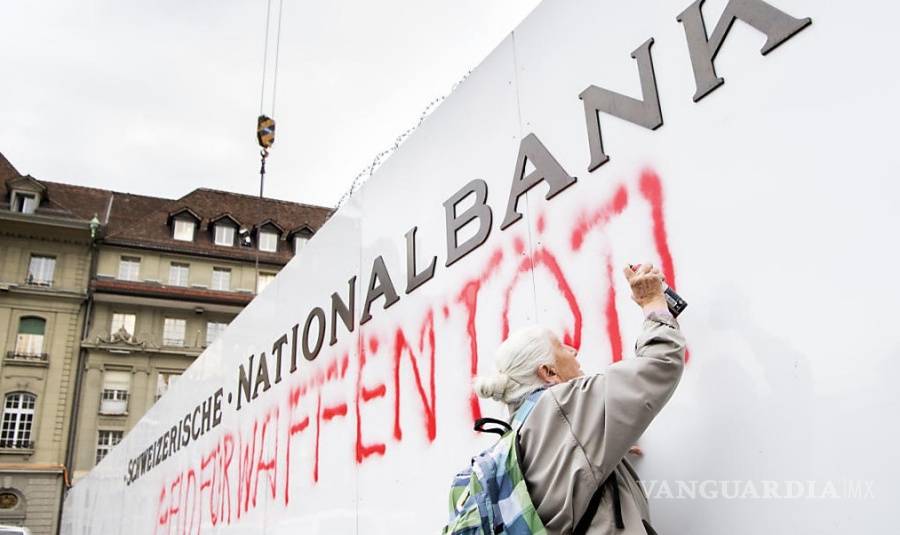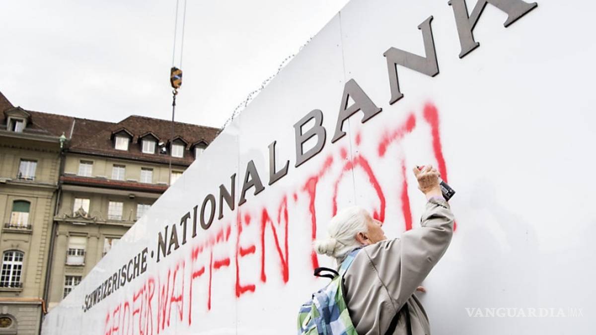 Una mujer de 86 años fue detenida brevemente por pintar con aerosol "El dinero para armas mata" en la pared exterior del banco nacional de Suiza durante una manifestación contra el financiamiento estatal para vendedores de armas, dijo el martes un grupo pacifista suizo.