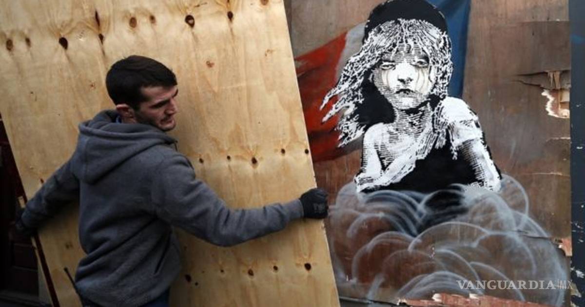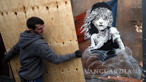 El graffiti apareció el sábado en la valla de una obra frente a la embajada francesa en Londres y representa a una niña de la novela Los Miserables, de Víctor Hugo, cubierta parcialmente por una nube de gases lacrimógenos, con la bandera francesa de fondo.