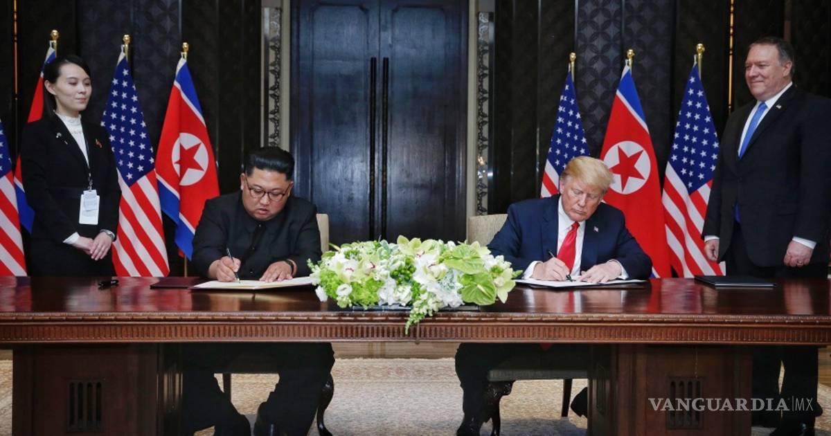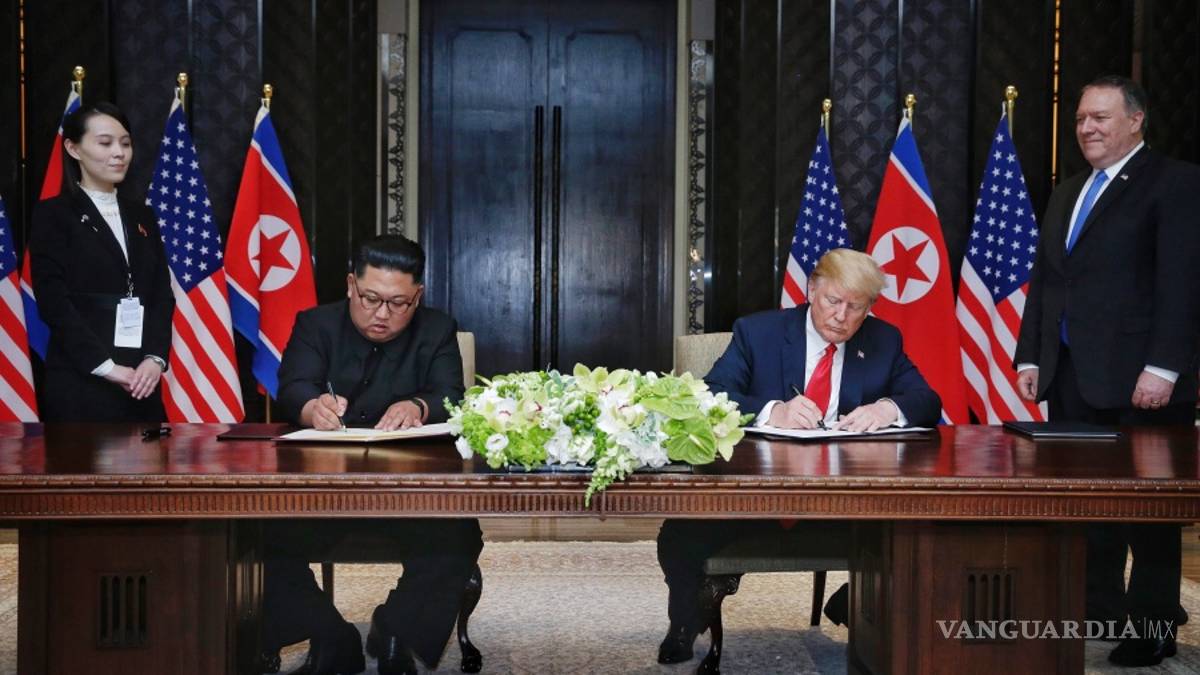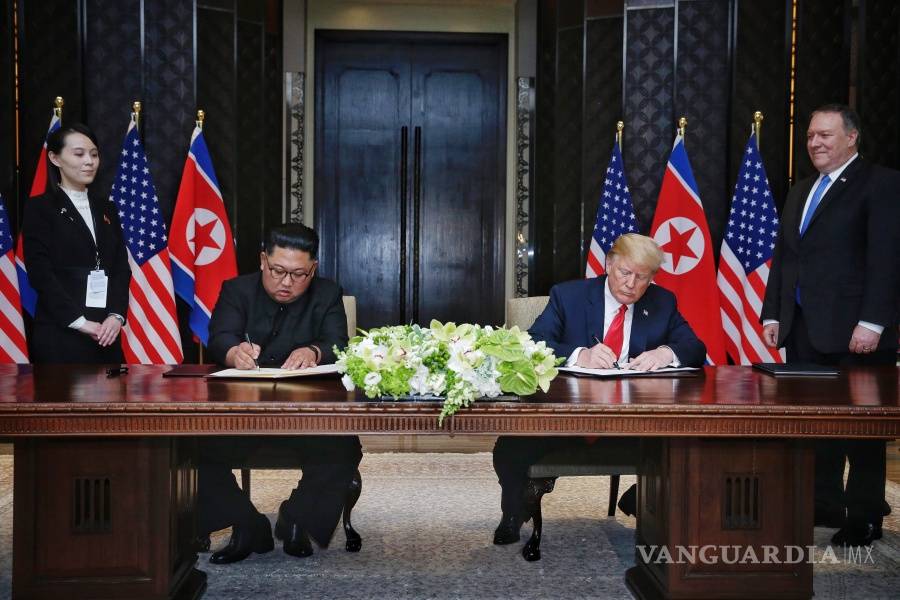 El presidente Donald Trump de Estados Unidos y el presidente de la Comisión de Asuntos Estatales de la República Popular Democrática de Corea (RPDC), Kim Jong-un, mantuvieron una primera e histórica cumbre en Singapur el 12 de junio de 2018.