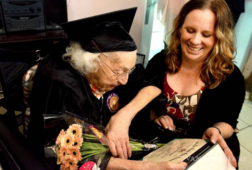 Con toga y birrete y diploma en mano en su asilo de ancianos en Oakdale, Theresia Brandl celebró el miércoles rodeada de cuatro nietos, ocho bisnietos y cinco tataranietos.
