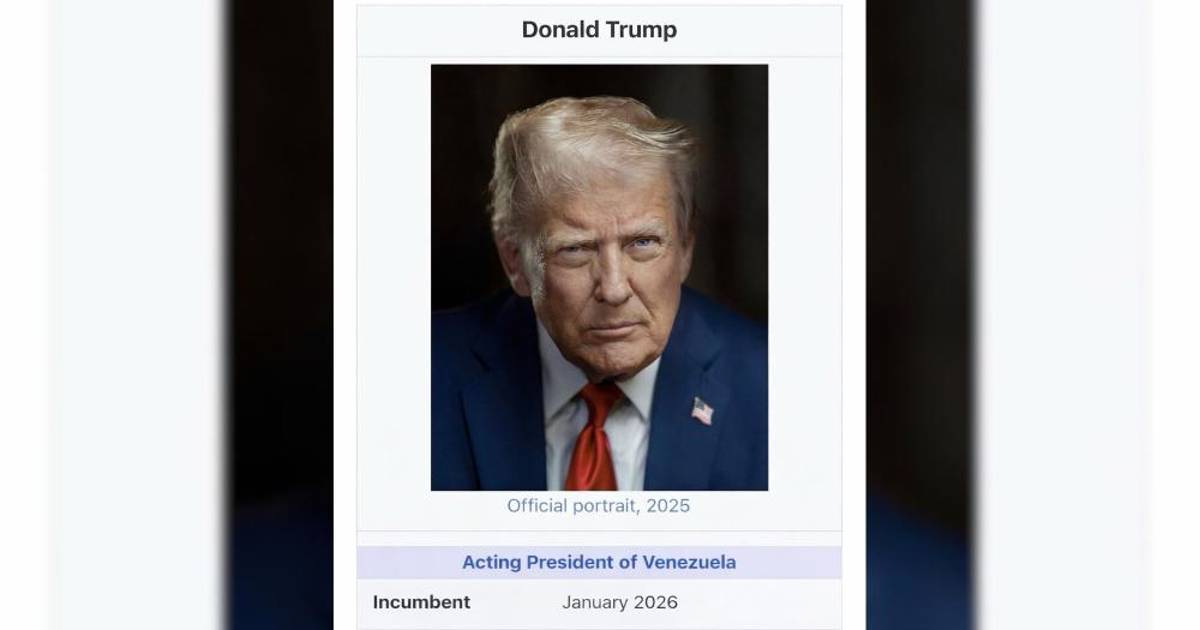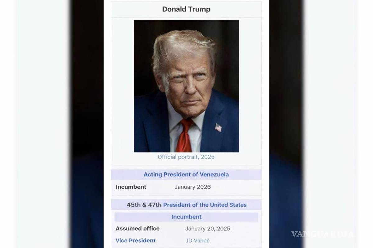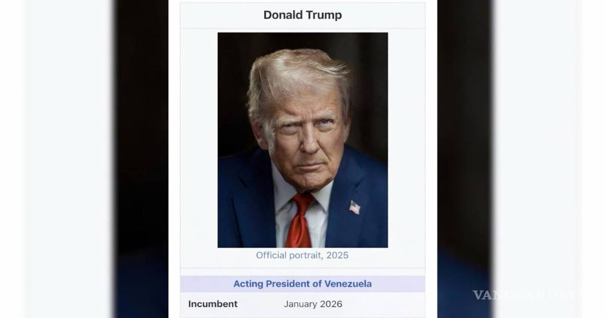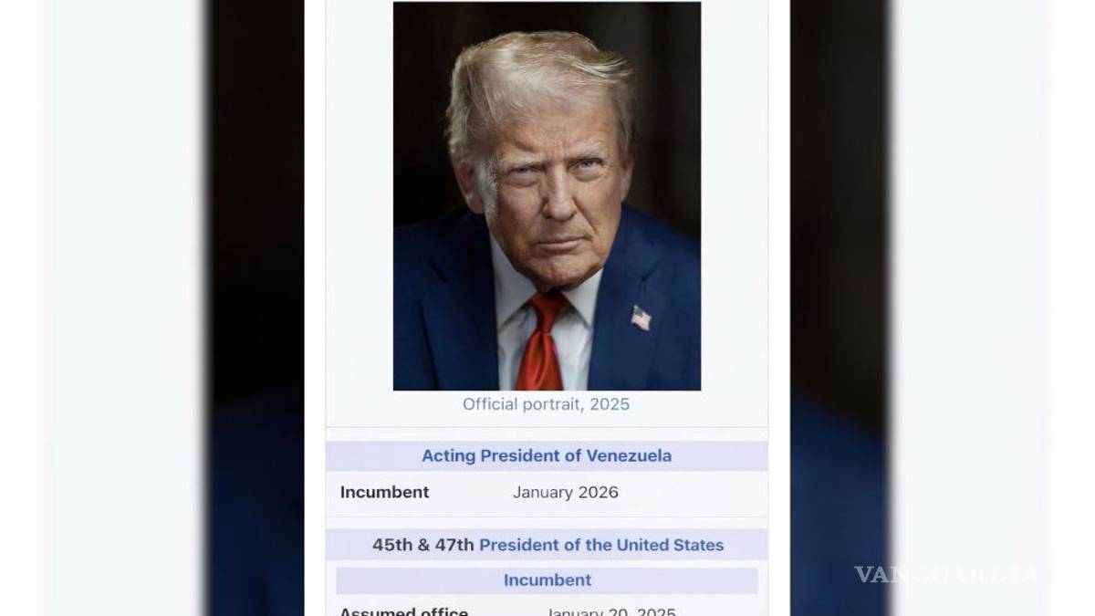 En su cuenta en Truth Social, Trump publicó una imagen parecida a la que aparece en las de Wikipedia, con una foto y el cargo de “presidente en funciones vigente”, señala, desde enero de 2026.