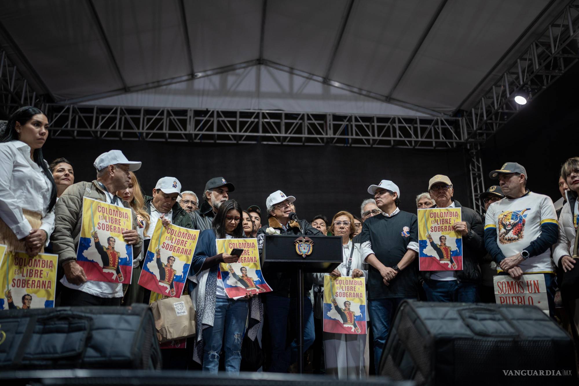 La concentración en la Plaza Bolívar, en el centro histórico de Bogotá, dejó pintas antiestadounidenses y carteles con lemas como “Somos un pueblo digno y soberano”. Una bandera colombiana fue atada a la estatua de Simón Bolívar, libertador de Colombia del dominio español.