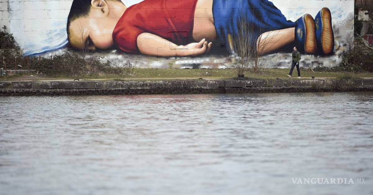 El mural está cerca del Banco Central Europeo en la ciudad en Frankfurt, Alemania. La gigantesca obra recuerda su historia tras conocerse el nuevo acuerdo europeo sobre refugiados.