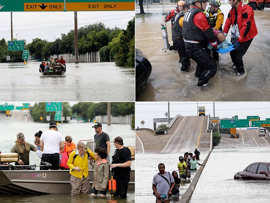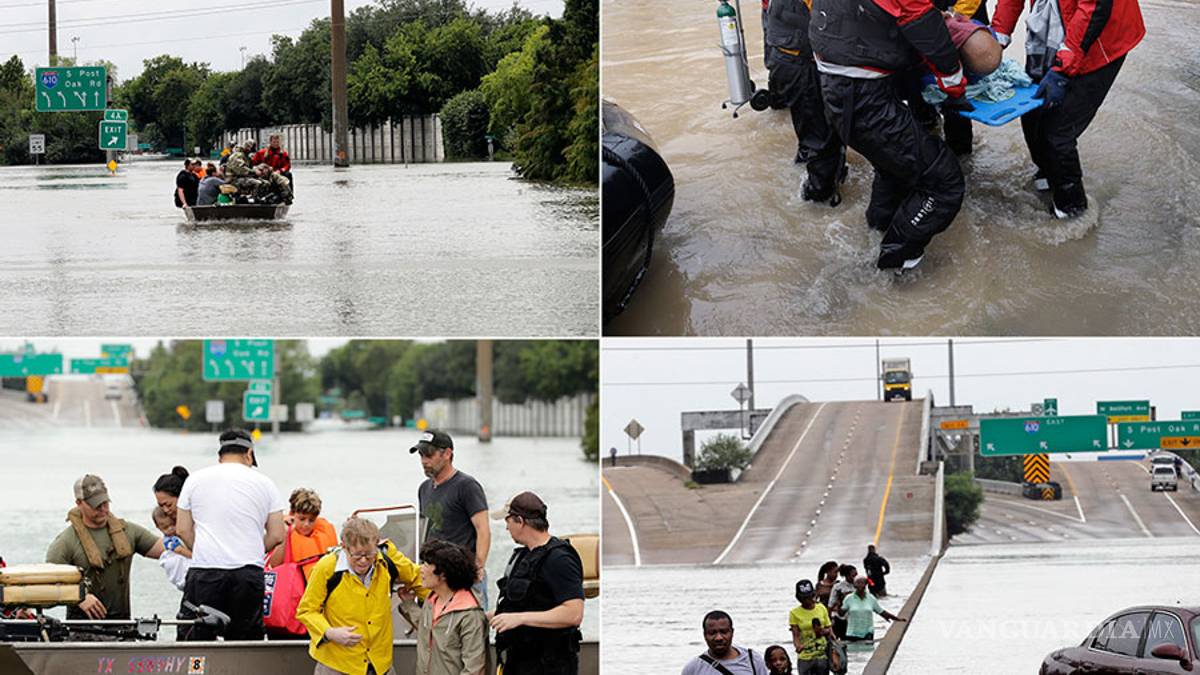 Helicópteros, botes y vehículos acuáticos recorrieron los vecindarios de Houston para ayudar a la gente a salir de sus casas o del agua turbia, la cual tenía un nivel tan alto que en algunos lugares alcanzó los segundos niveles.
