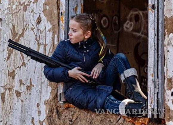 La imagen de una niña con fusil en mano sentada en la ventana de un edificio con daños estructurales, la pierna derecha estirada y la mirada atenta hacia la ciudad, vigilando se ha hecho viral al reflejar lo que ocurre en una Ucrania ocupada por los rusos.