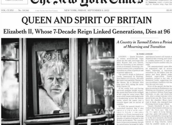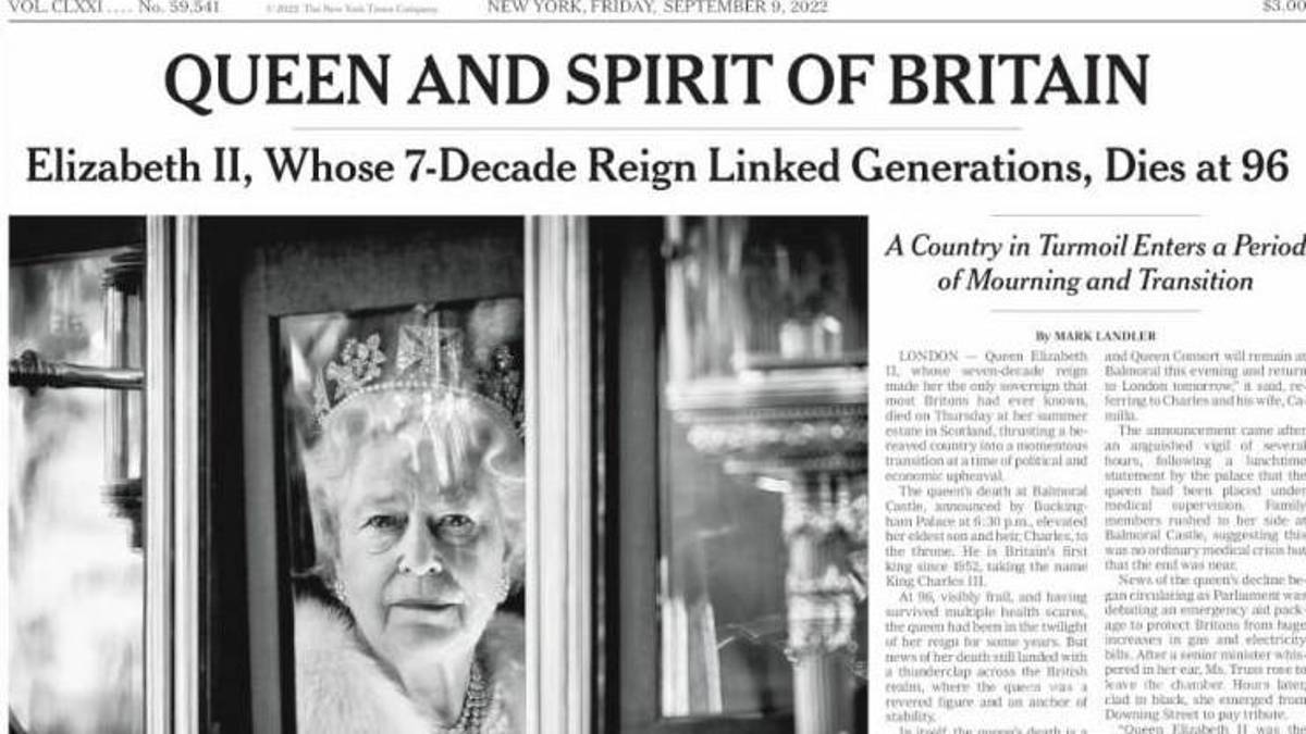 The New York Times tituló su portada como: Reina y espíritu de Bretaña, mencionando que reinó durante siete décadas, y murió a los 96 años. Y también mencionan que el país en crisis entró a un periodo de luto y transición.