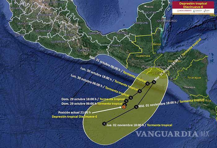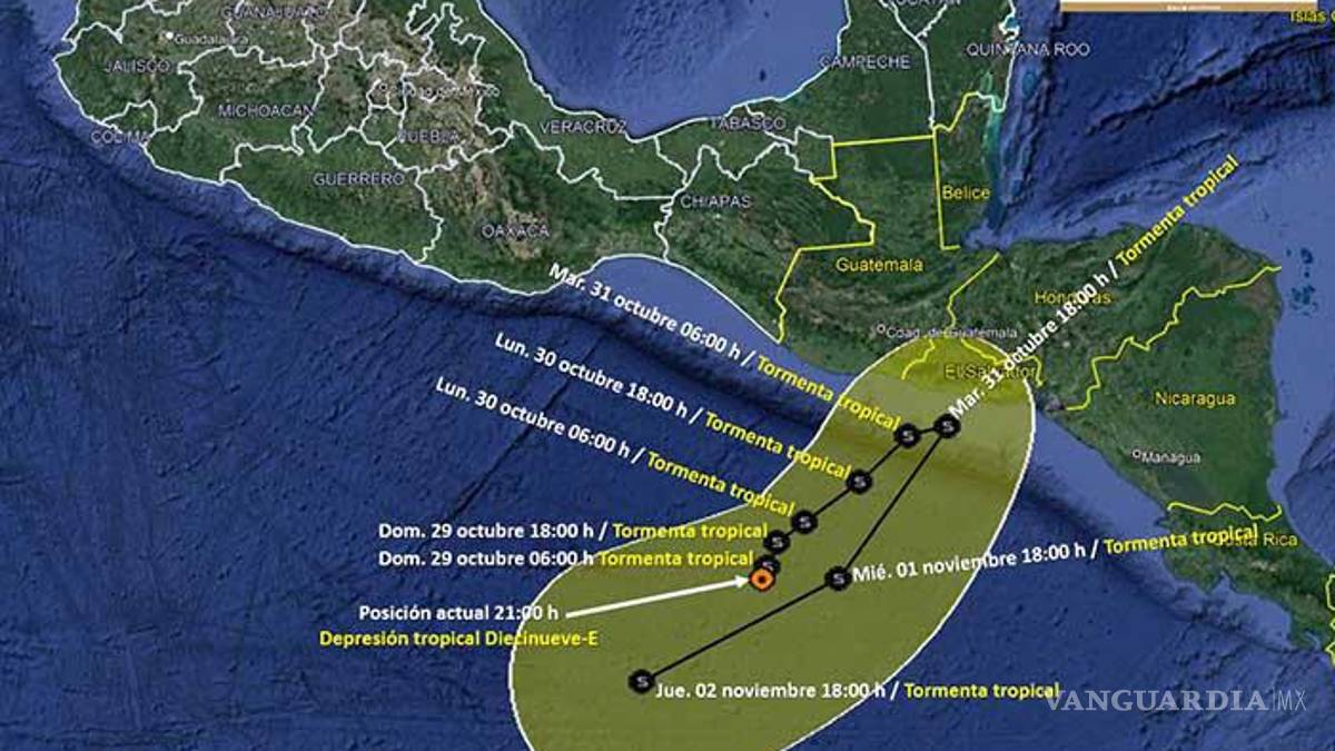 “La Depresión Tropical Diecinueve-E se localiza esta mañana a 395 kilómetros al sur de la desembocadura del río Suchiate. Ocasionará hoy lluvias de muy fuertes a intensas y viento de 50 a 70 kilómetros por hora en Oaxaca y Chiapas”, advirtió en un aviso informático.