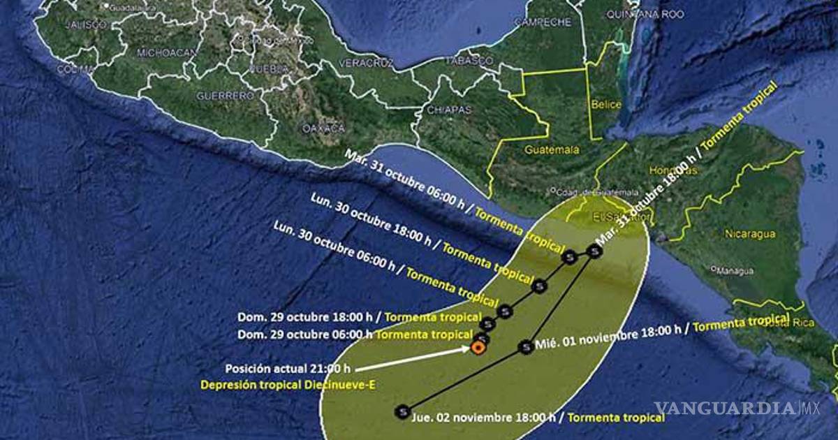 El Servicio Meteorológico Nacional (SMN) avisó este sábado de la formación de la depresión tropical Diecinueve-E al sur de las costas de Chiapas.