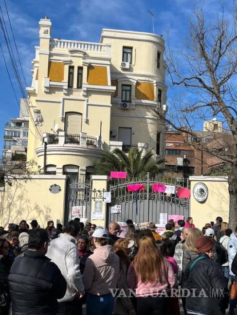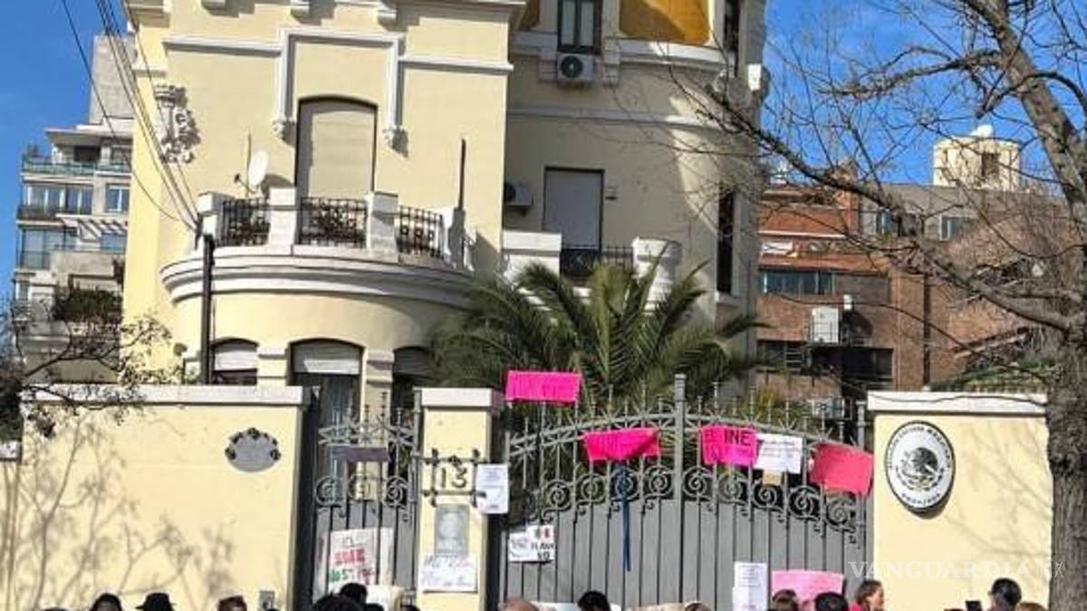 Al unísono, al exterior de las instalaciones de la embajada de México en Madrid, gritaron “¡El INE no es cash!”.