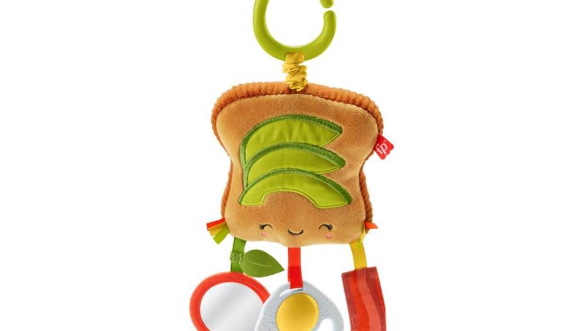 Este juguete, que puede colgarse de una carreola, mochila y otros muebles para bebé, cuenta con una tostada de aguacate falsa y tres accesorios: un tomate espejo, un tocino arrugado y un mordedor de huevo, éste último el principal problema.