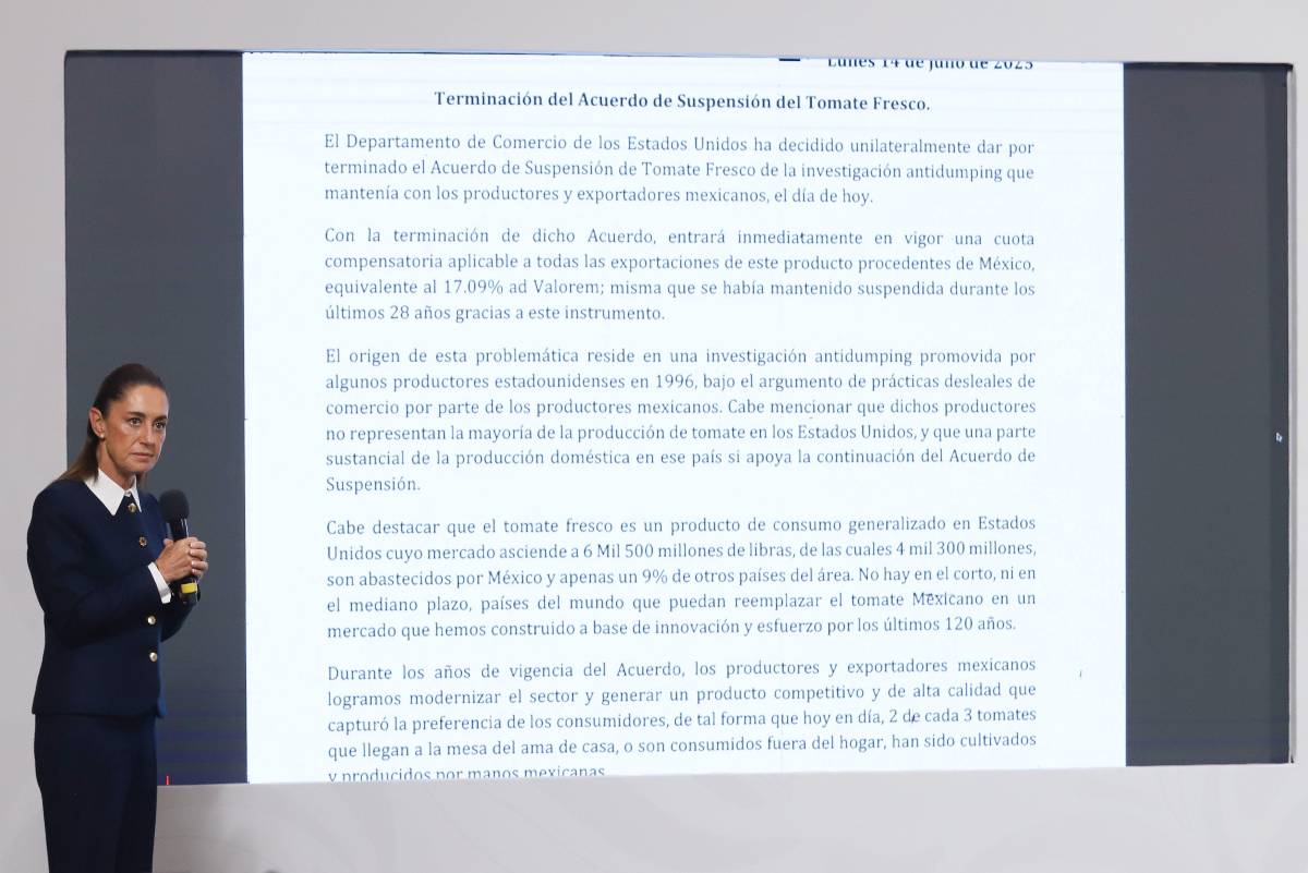 Como en los aranceles generales y en otros productos, Sheinbaum dijo que la cuota compensatoria que Estados Unidos impone al tomate perjudicará en mayor medida a sus consumidores, pues es “muy difícil” sustituirlo.